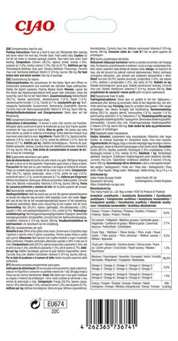 Zutaten: Wasser, Huhn, Tapiokastärke, Jakobsmuschel, Sojaöl, natürliche Aromen, natürliches Jakobsmuschelaroma, Guarkernmehl, Fischöl, Vitamin-E-Ergänzung, Taurin, Grüntee-Extrakt